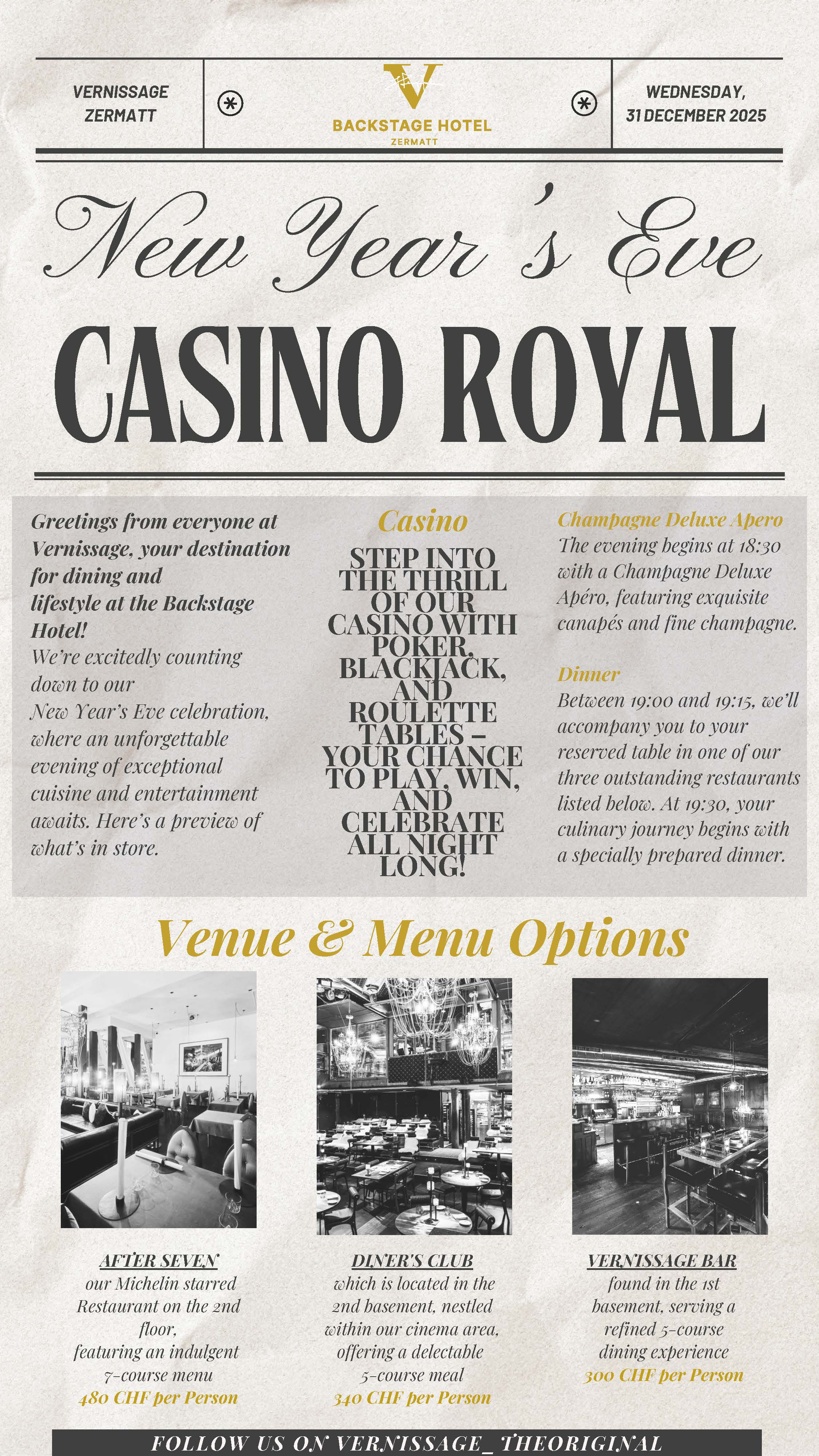 Throughout the night, the Casino Royale theme will add a touch of intrigue and glamour, creating a truly immersive experience. From stylish décor to the lively ambiance, every detail has been crafted to make your New Year’s Eve unforgettable.